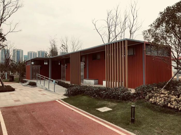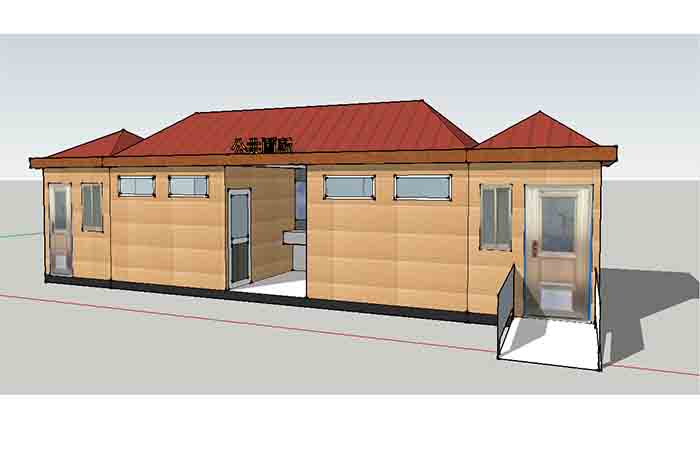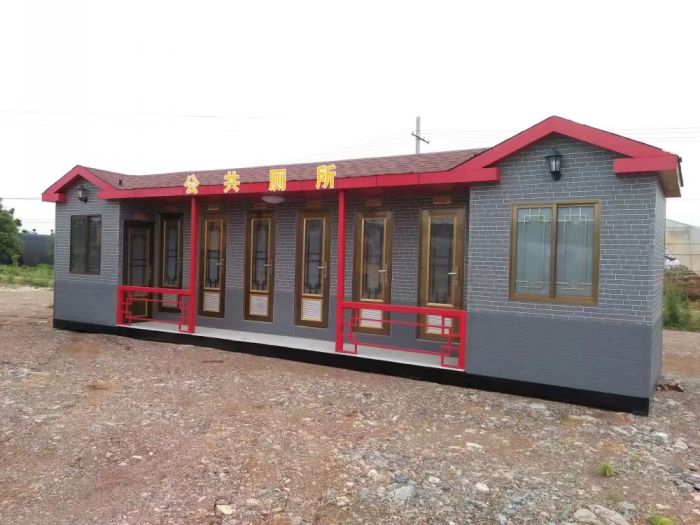 拼裝廁所;在廠里做好各個(gè)廁所部件,再到現(xiàn)場(chǎng)組裝在一齊,適合不易運(yùn)輸?shù)拇笮蛶_@座箱式廁所,女廁5個(gè)蹲位內(nèi)配工具間,男廁2個(gè)蹲位+2小便斗,第三衛(wèi)生間由殘疾馬桶、助力洗手盆和兒童馬桶、兒童洗手盆外加?jì)雰号_(tái)等設(shè)施。廁所前后有窗,通風(fēng)采光,前部走廊裝有屋檐,防雨防曬。此廁所位于公路綠道邊,整體大氣,功能齊全,造型美觀,是一道難得的靚麗景觀!